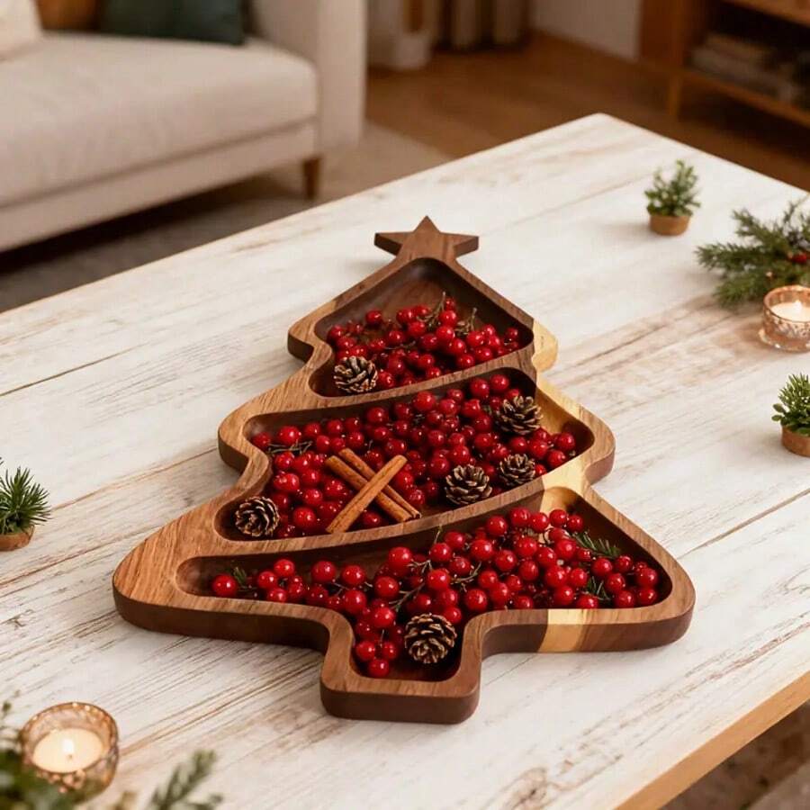1 Peça Bandeja de Servir com Formato de Natal, Prato Decorativo Reutilizável para Lanches, Doces, Frutas, Travessa Multiuso para Sobremesas, Tábua de Queijos de Madeira, Adequado para Decoração de Natal, Lembrancinhas de Festa, Decoração Outonal para Casa, Ambiente Encantador