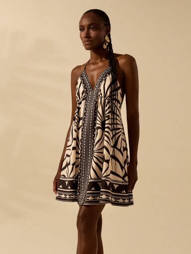 CAJUNI Vestido Curto Casual de Verão Vestido de Praia, Decote em V sem Mangas Decotado nas Costas, Estampa Tropical Preta e Bege, Estilo Boho