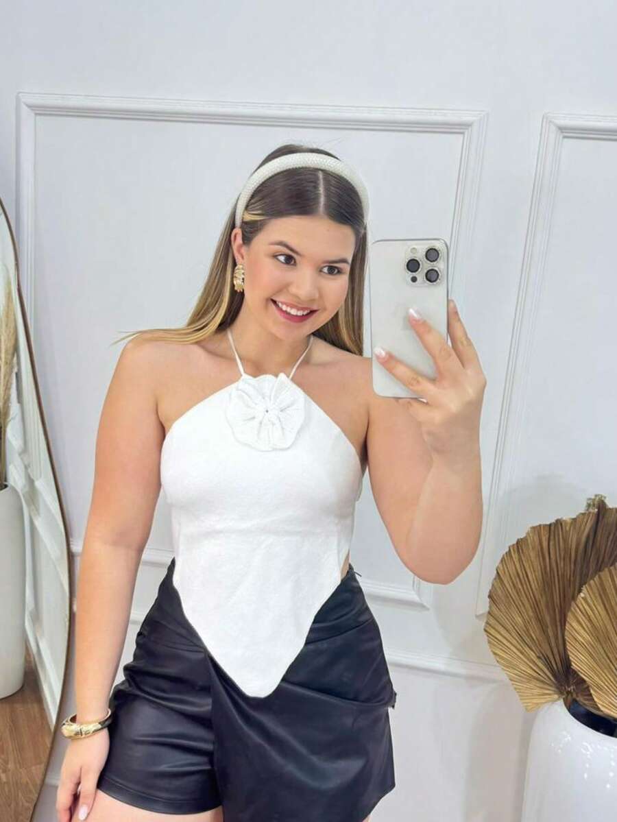 Top Feminino Flor Tricot Flor 3D Costas Nuas Feminino Chic com Flor em Relevo e Alça Fina Verão Trend Simples Tecido de malha Rosa 3d Assimétrico Nó Festa Elegante Final De Ano Primavera Verão Férias Praia