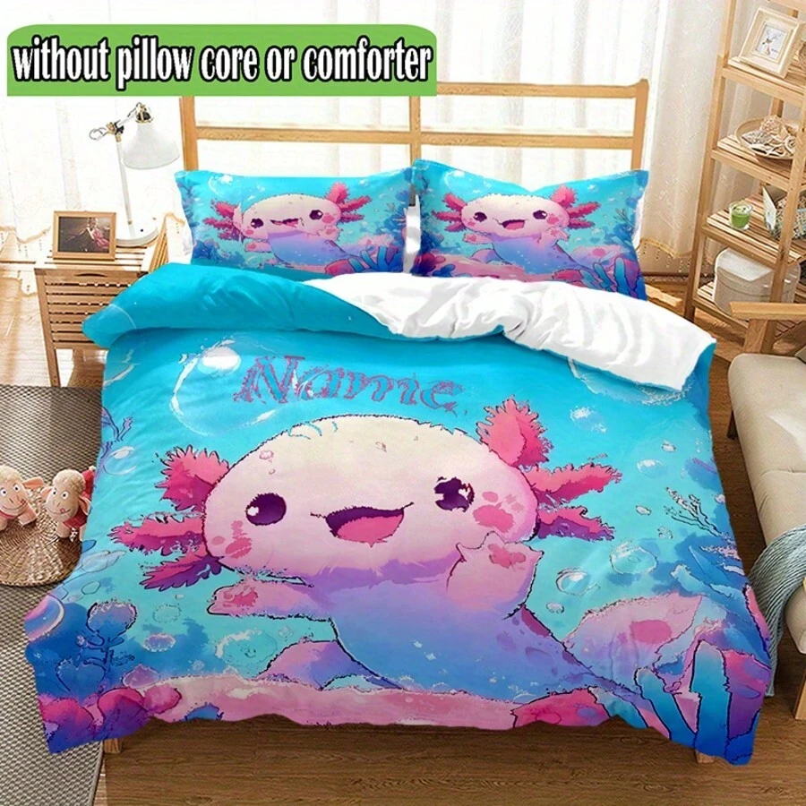 3 Peças Conjunto de Capa de Edredom Macio e Resistente a Rasgos com Estampa Fofa de Axolotl - Roupa de Cama Personalizável para Todas as Estações - Inclui 1 Capa de Edredom e 2 Fronhas (Sem Enchimento)