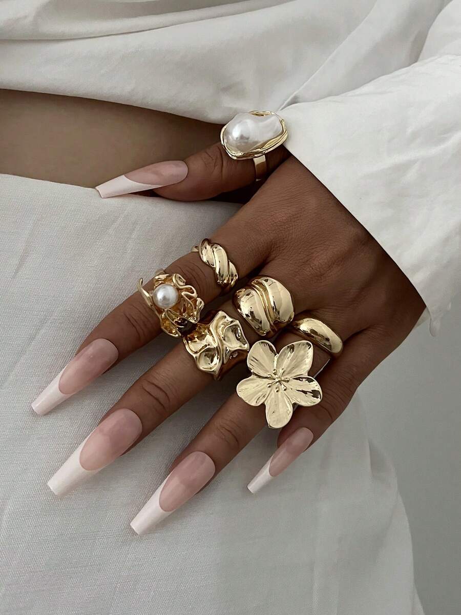 17KM 7 Peças Conjunto de Anéis Empilháveis Elegantes, Minimalistas e Retrô - Moeda Vintage, Flor, Assimétrico, Pérola, Textura Pregueada, Cruzamento Geométrico, Trançado, Liso, Anel de Banda Larga Grosso, Adequado para Férias, Festa, Encontro, Presente, Uso Diário