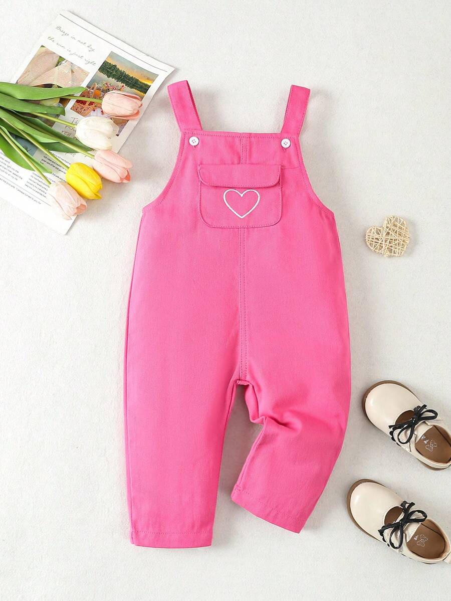 Macacão Jeans Bordado Com Coração E Bolsos Com Aba Para Bebês Meninas