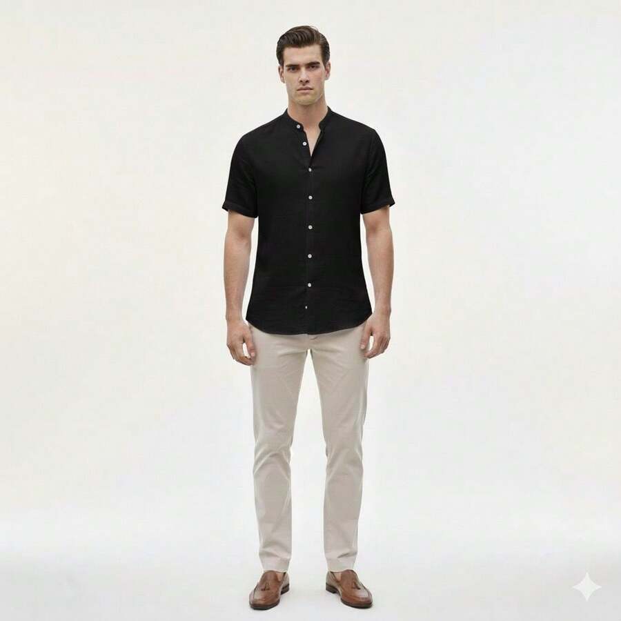 Camisa de algodão masculina estilosa, manga curta, com botões, gola lisa, design essencial para o verão