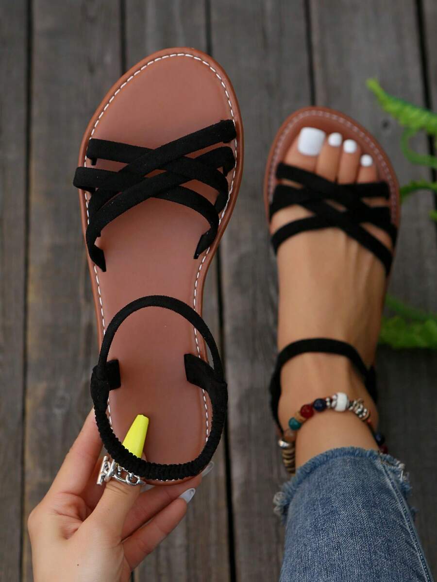 Novo Verão Sandálias Rasteiras Femininas com Tiras Cruzadas e Elásticas, Estilo Peep Toe Europeu e Americano