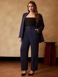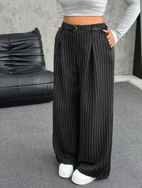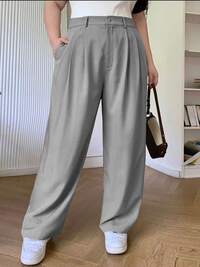 SHEIN CURVE+SHEIN MOD Calça casual de cintura baixa com amarração na cintura e perna larga para mulheres plus size, Outono/Inverno, Natal, Saída, Calça Cinza, Trabalho, Escritório, Calça de Negócios, Calça de Cintura Alta, Calça com Laço, Calça Perna Larga, Calça Perna Larga Feminina, Calça Cinza Carvão