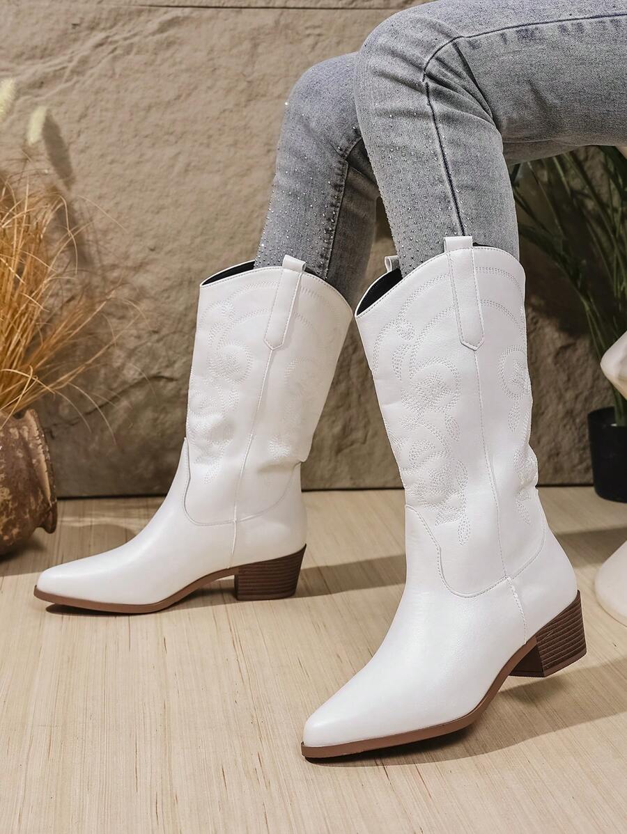 Botas de Cowgirl de Estilo Oeste para Mulheres Plus Size, Bota Cano Médio Pontuda com Salto Tratorado Bordado