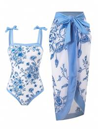 SHEIN Maiô de uma peça para adolescentes com estampa de conchas azuis, combinado com saia de tule, elegante, jovial, vibrante, fofo, energético, adequado para natação, férias, praia, piscina, sessões de fotos, presente de verão #2 Mais Vendido