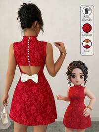 Elenzga Vestido Vermelho Texturizado de Jacquard Floral com Gola Alta e Silhueta em A, com Cintura Marcada e Detalhe de Laço, Design Elegante e Sofisticado para Aniversário, Encontro à Noite, Festa, Ocasião Formal, Dia dos Namorados, Ano Novo, Carnaval, Páscoa, Dia do Trabalho, Viagem, Temporada de Primavera