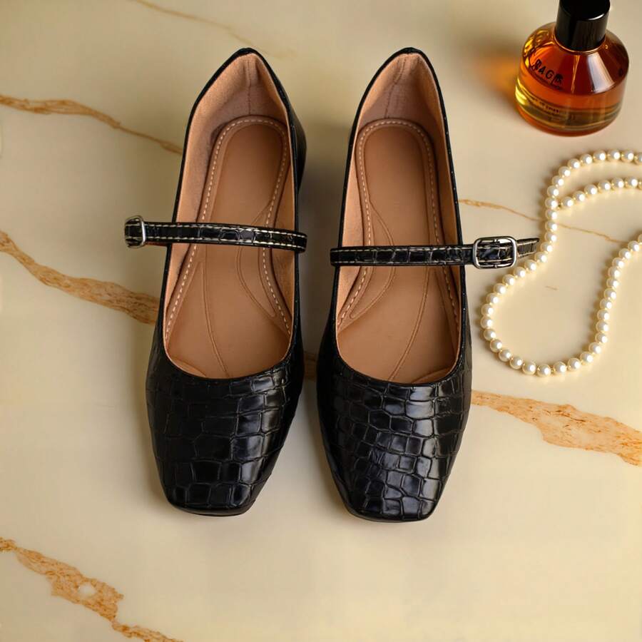 Sapatilha Feminina Bico Quadrado Verniz Croco Preto – Delicada, confortável, toque macio, acabamento impecável