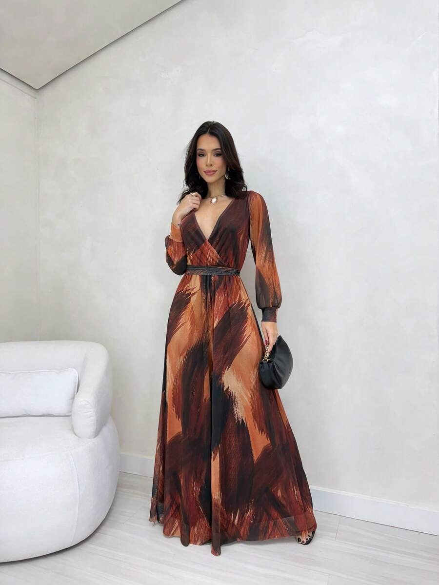 Macacao Feminino Acinturado Barra Larga Forrado Manga Longa