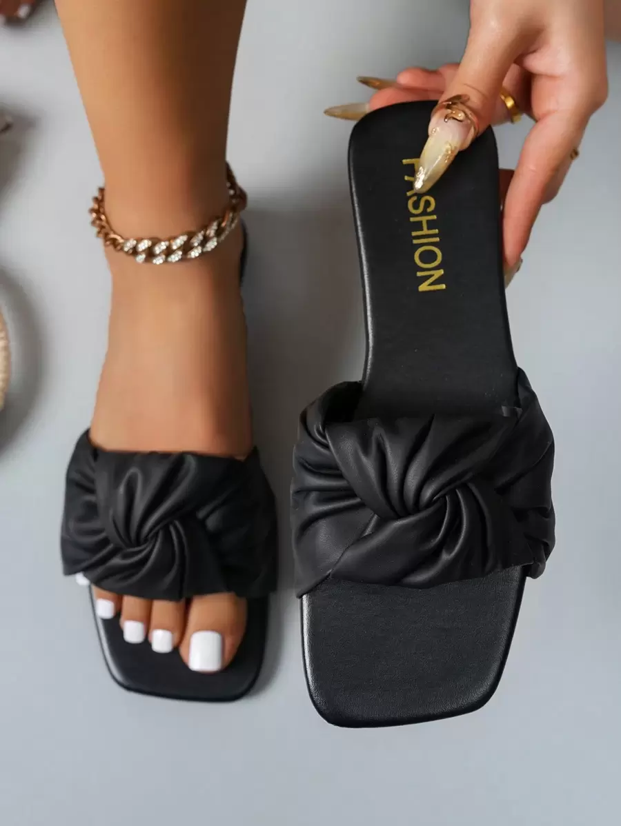Sandálias de tiras com design de rosa franzida feitas à mão para mulheres, Parte superior bonita e fashion, Solas com estampa de folha, Sapatos casuais de verão com bico quadrado e sola plana, Chinelos leves