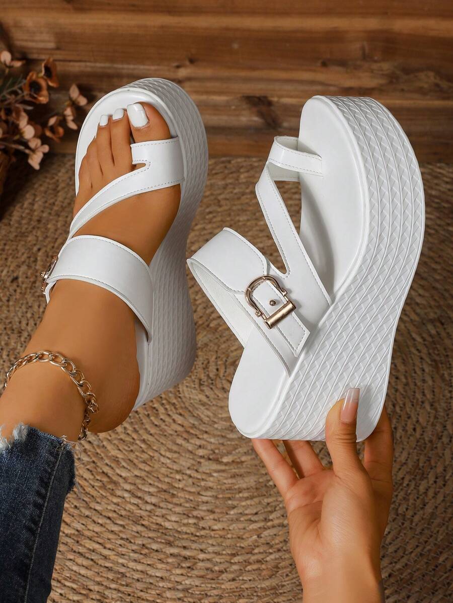 Sandálias de Plataforma e Cunha Decoradas com Tanga Multicolorida, Moda de Verão Feminina, Casual, Confortáveis para Férias, Combina com Vestido ou Calça, Clássicas, Bico Aberto, Respiráveis, em Couro PU