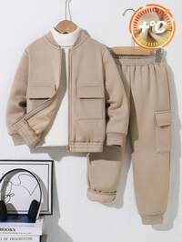 SHEIN 2 Peças Conjunto Casual Esportivo de Meninos Jovens com Listras, Bolso, Manga Longa, Colarinho de Beisebol, Jaqueta com Zíper e Calça de Cor Sólida com Cordão, em Malha, Adequado para Escola, Jardim, Praia, Aniversário, Primavera, Verão, Outono e Inverno